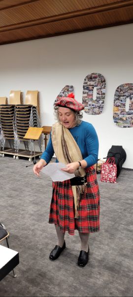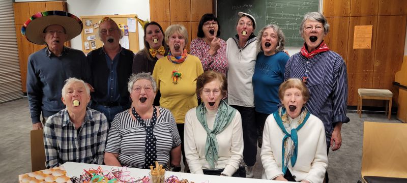 Nach einer kurzen Singstunde ging es mit 'Musik macht gute Laune' in die närrische Nachfeier. DerProbenraum wurde schnell dekoriert und Knabbereien und Getränke aufgetischt. Siegmar sorgte für die richtige Sängermundöffnung in dem jeder einen Mohrenkopf hochkant zwischen den Lippen platzieren musste. Uli kam als Schotte und 'suchte das rechte Maß mit was soll den das'. Bei der anschließenden musikalischen Frage: 'Wer soll das bezahlen', wurde Andrè genannt, denn er hatte die Zeche für die Getränke übernommen. Vom Handy gab es den Fasnetshit 'Gute Laune' und alle machten mit bei: Oben gute Laune, unten gute Laune, vorne gute Laune und hinten gute Laune.